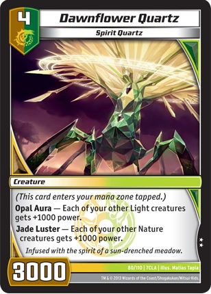 Opal Aura — Each of your other Light creatures gets +1000 power. Jade Luster — Each of your other Nature creatures gets +1000 power. |