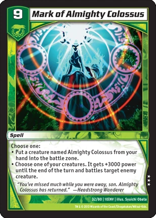 | Card Abilities: | Choose one: ● Put a creature named Almighty Colossus from your hand into the battle zone. ● Choose one of your creatures. It gets +3000 power until the end of the turn and battles target enemy creature. |