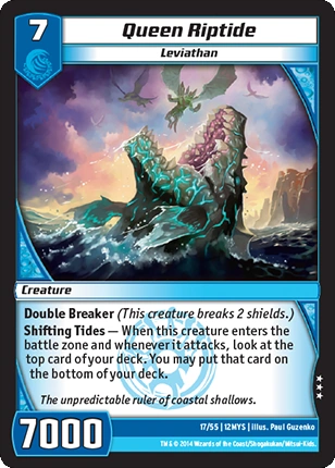 Shifting Tides — When this creature enters the battle zone and whenever it attacks, look at the top card of your deck. You may put that card on the bottom of your deck. |